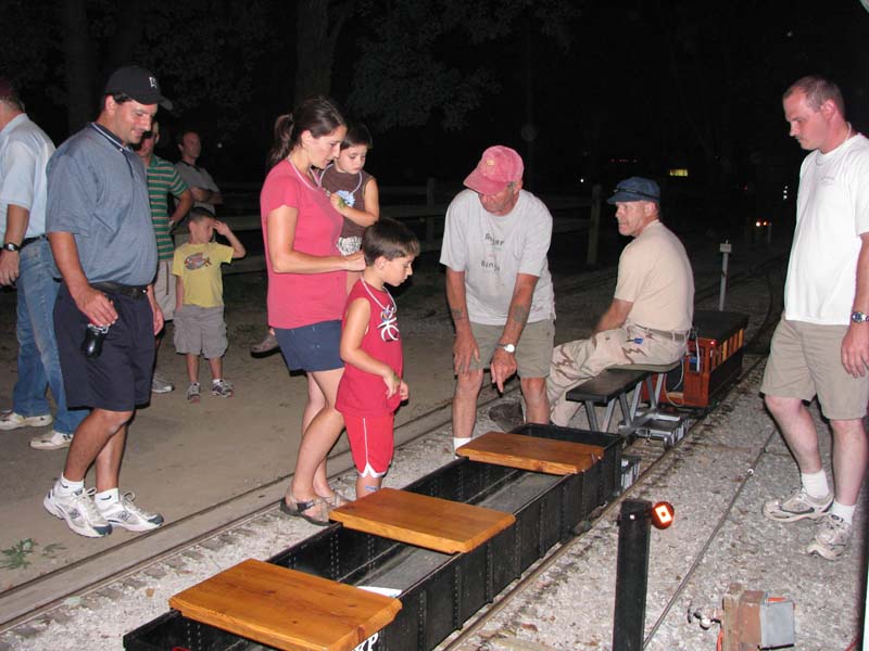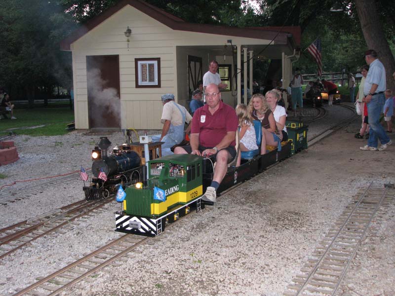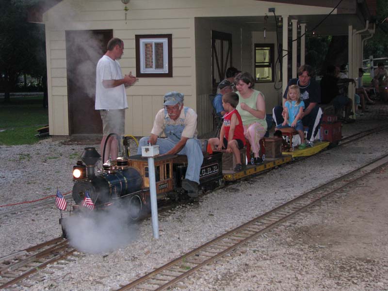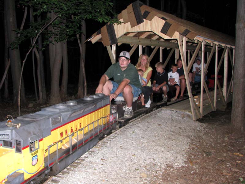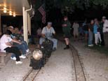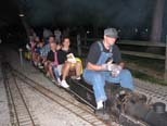 Frank, with Bob Bassett as conductor brings his load of passengers back to the station. Rick with a light on his cap so he can see the gauges for the engine brings the train to a gentle stop. |
