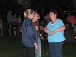 No that's not Rudolph but the crossing light blinking behind Kitty Shriver as she talks with a rider as Bob listens. Robbi Haines, in light blue blouse, talks with the riders between loading the trains. |