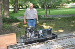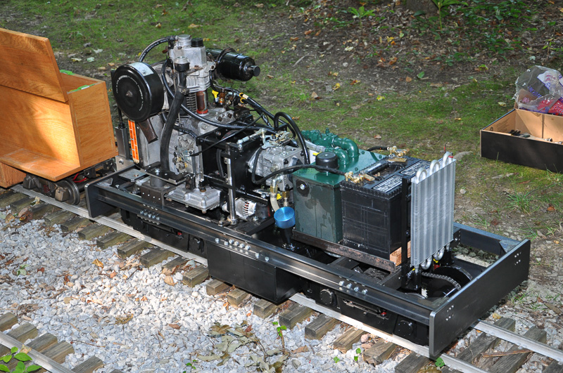 One of our members, Bob Craig, has been working on a diesel powered switcher using an actual diesel engine. He had it sitting on the siding by the station with the engine just lumbering along at idle. |