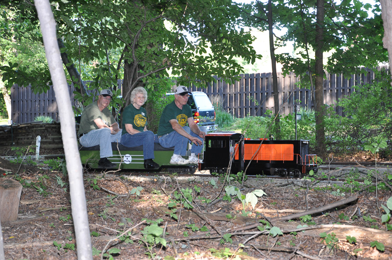 A few minutes later Frank, Lois and Judy rolled into the station behind his gas powered switcher and Frank is all smiles. Running eastbound towards the station Scott Hewis gives a wave with his passenger and Paul Emch riding in the gon. |