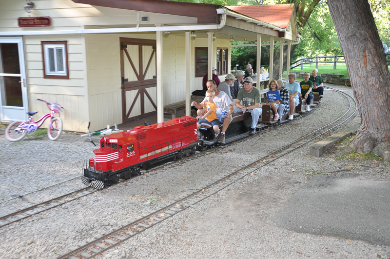 Cory Guy is at the controls of the GP38 as his dad gives him instructions before departing with a loaded train. Bob and Donna Craig along with Ron Trenhaile standing to the left of the station as Cory advances the shifter on the engine and starts to depart the station. |