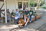 With Greg Guy standing by the table, Bill with Marie seated behind and Cory and Carley Greg on the second unit are about to leave the station. As I waited for a block signal at Horrendous, Frank and Lois Smoley with their train pass by on the mainline with Steve Zaken riding behind them |