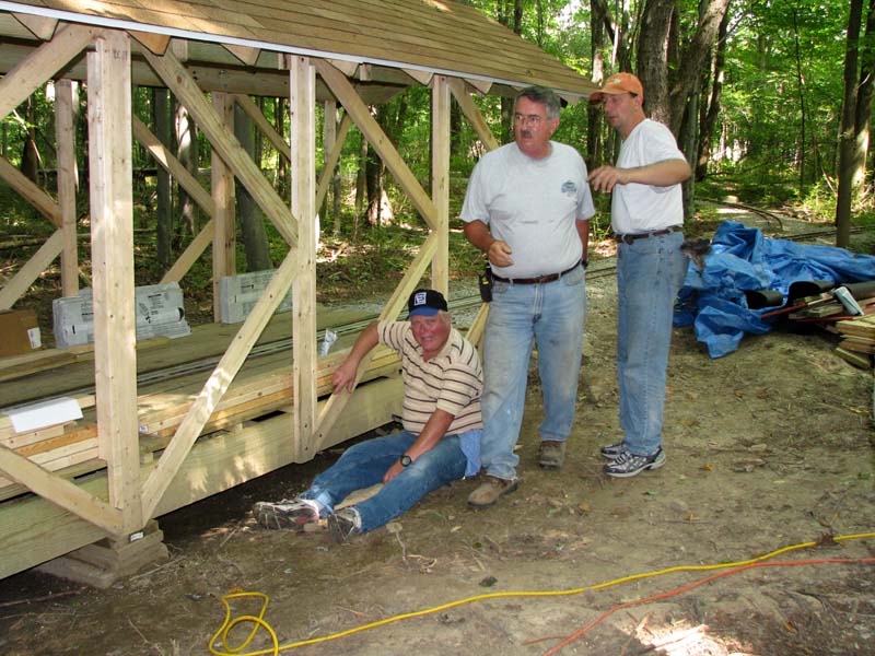 John Koontz, Dave Foster and Frank Foti confer on the best way to add bracing to stiffen the covered bridge structure. Bill Deptowicz brought a pattern to cut out the cupola beams and Ken Brooks is fastening them to the vertical supports. |