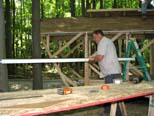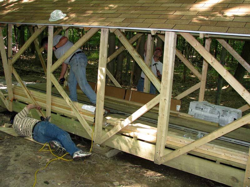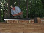 A close up shot showing the line we strung between the end supports to keep them all in alignment. Ken screwing the decking down as Bill holds the panel in place, George provides the screws and Steve Zaken holds the ladder. |