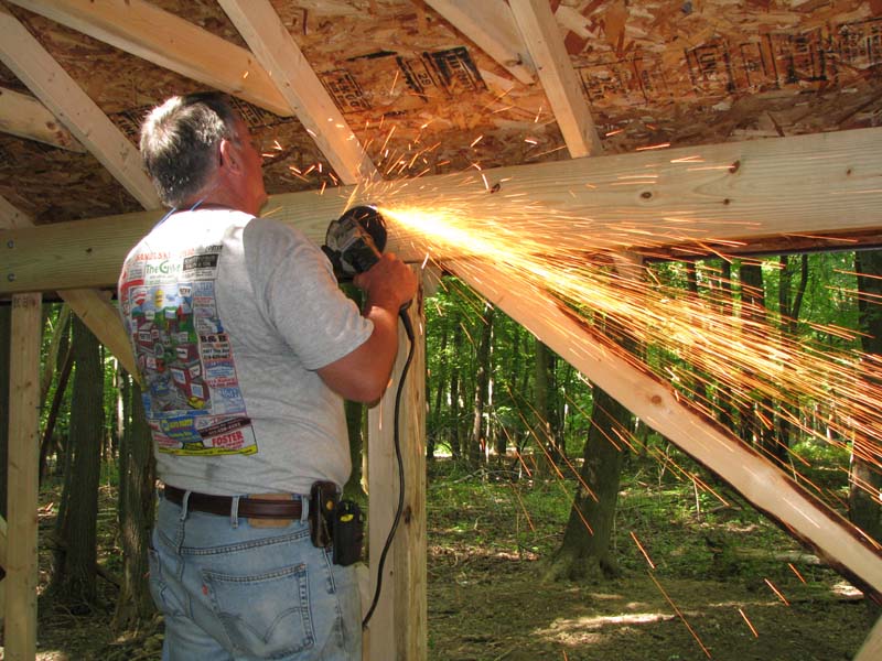 Dave cutting off the ends of the carriage bolts that project beyond the nuts on the inside of the header beams. The nine cupola roof frames in place through the opening we left in the roof. |
