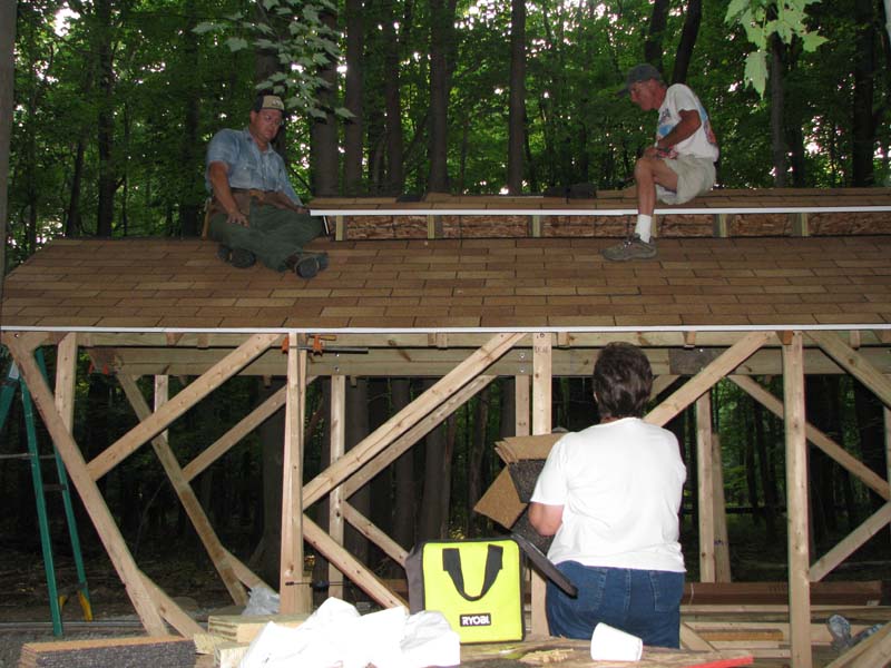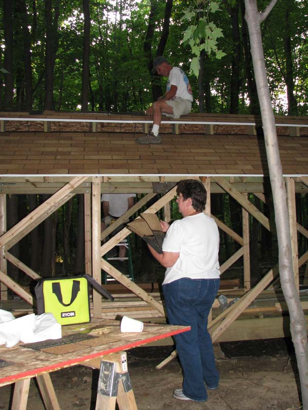 Bill Besselman on a ladder taking pictures of the progress. Karl hammering down a stubborn nail in the starter strip for the shingles. |