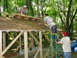 Ken applies the building paper to the cupola roof and shingles will go up next. The guys decided on diagonal bracing like this to stiffen the covered bridge from side sway. |