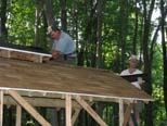 The roofing is looking good as Karl and Roger take a breather and relax for a few minutes. With the guys looking tired and hot there are only a few more shingles to put in place. |