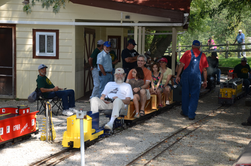 Roy Harris has just finished loading Richard Sales train and he will shortly begin his 1st run of the day. Judson Elliott with his scratch built electric box cab that he's building is departs the station with his passengers. |