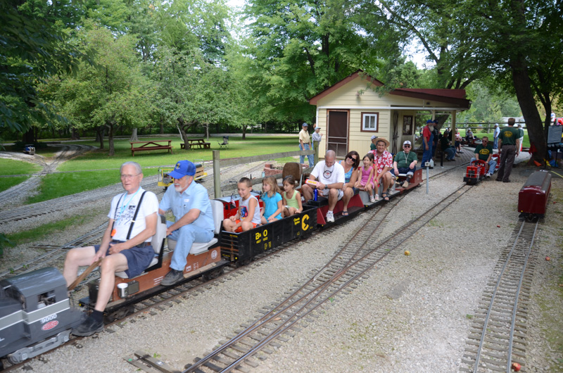 With his hopper loaded with children and a full load of passengers, Don Speidel with his SW9 leaves the station with Lew Fowler riding as his conductor. Rick slowly moving through the switches from mainline 2 to get to mainline 1 as he departs with another load of passengers. |