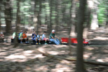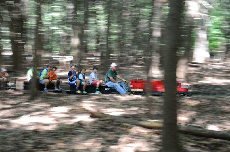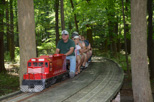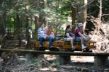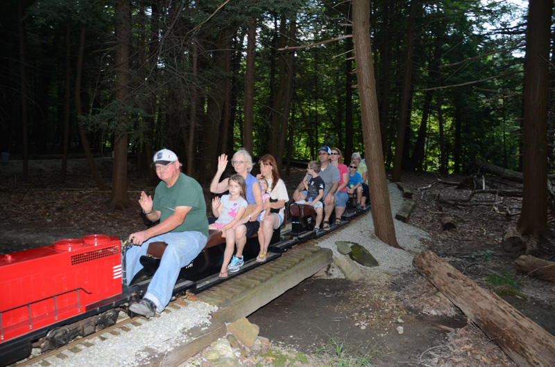 A picture looking from Drudgery through the woods towards Horrendous as Dick Clark with his SW1500 starts to take the grade down towards Filmor giving you an idea of the wooded area we run through with our trackage. Richard has just passed over the Park Access Road crossing with his passengers. |