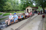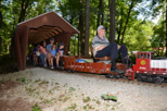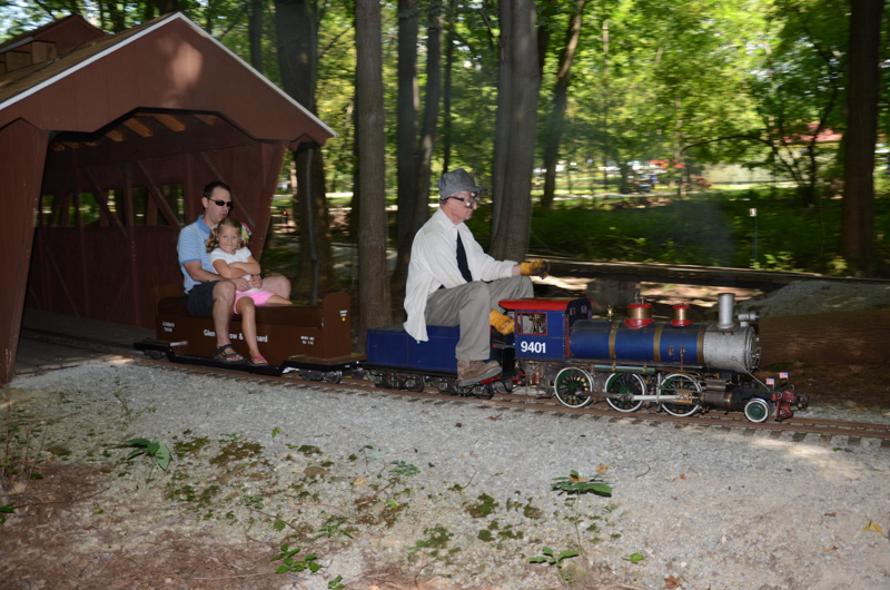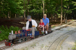 A good vantage point to watch the trains as they emerge from the Covered Bridge and here we have Chet Roberts running with 2 passengers as he takes the slight grade up to Zip Junction. John as he nears the ends the run, will soon be passing over Cider Bridge and taking the loop into the station with Steve as his conductor. |