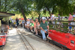 A beautiful day for a public run today as the trains gather at the station and the members wait for the beginning of the run, which is 1 o'clock. Dave Foster talks to Dick Clark as Paul Zorko departs the station with his 1st load of passengers. |