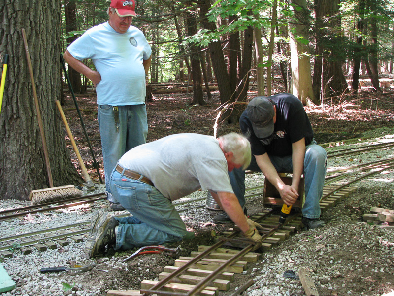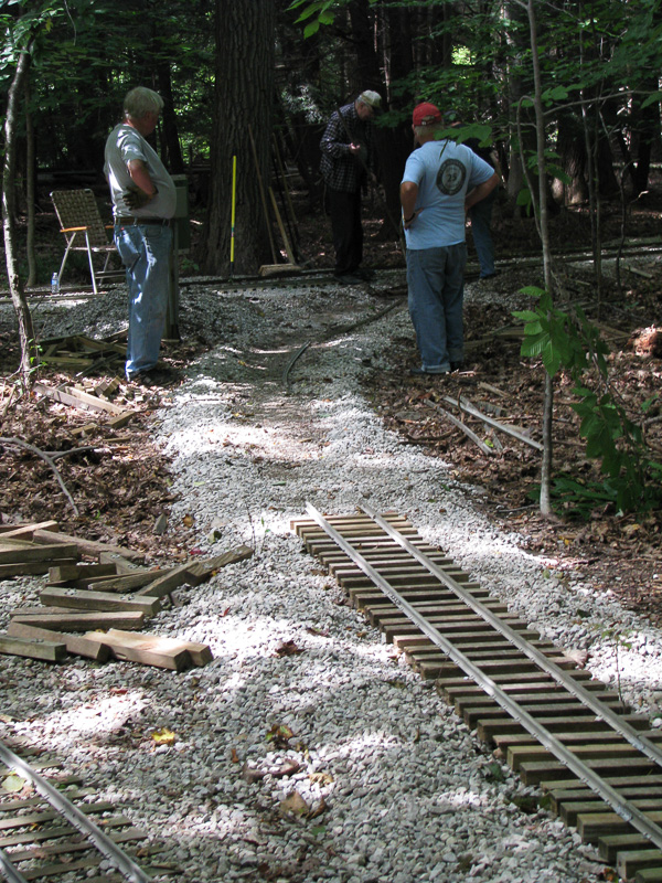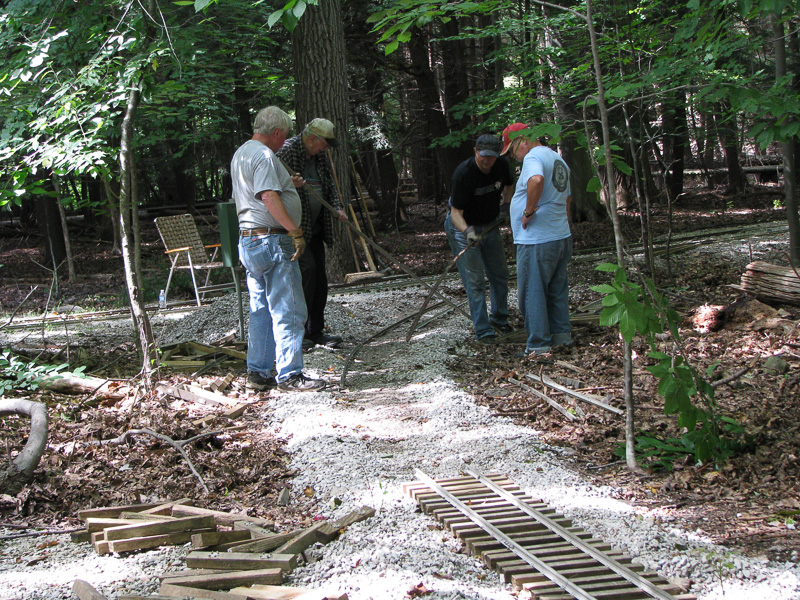 We had some track panels that we are reusing from another area that was replaced with steel rail and they are laid in position behind the guys. Dick and Rick taking a break in the background as Lew Fowler watches John with the tie lifter and Frank driving the screws in. |