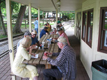 Frank Foti runs the work train through a set of switches to get on to the Branch Line where we will be working today. The crew waits for lunch to start serving, as they wait patiently for the dinner bell to be rung. |