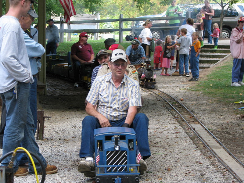 Rick coasts into the station with his load of passengers with Pam Znidar as conductor of his train. Judson arriving at the station with his train and at the rear is George Woodling as conductor. |