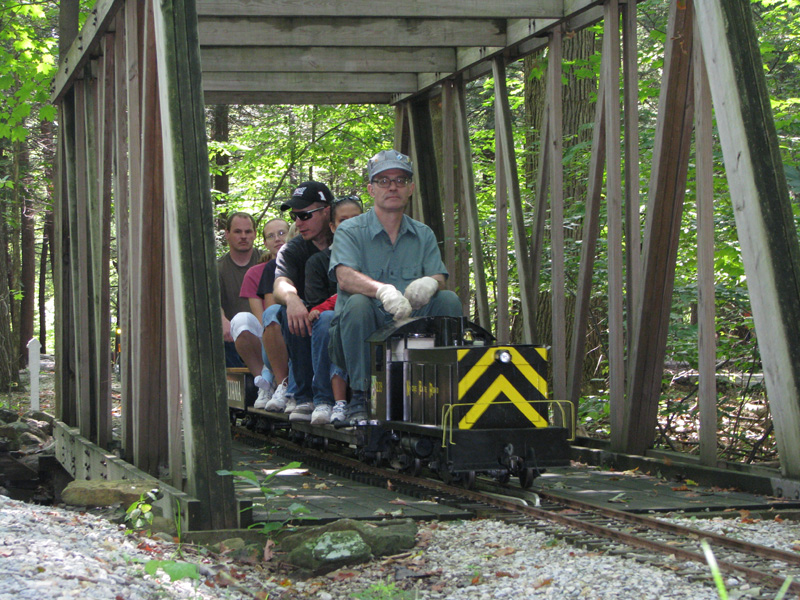 A good spot for train pics as Tom rumbles by with his trainload of passengers. George passing thru the bridge with Paul Emch as his conductor at the rear of the train. |