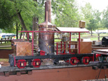 Dick Schmidt with his little gas powered switcher leaving the station with a load of passengers. Skip leaves the station with the cylinder drain cocks open to relieve the condensate. |