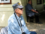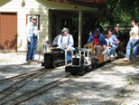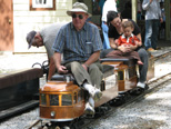 Marty with his electric powered scratch-built boxcab about to leave the station. Today our passenger counter is Bill Besselman who will dutifully count each passenger that boards a train today. |
