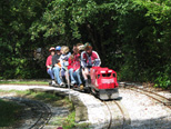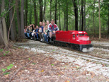 Mike Harkleroad with Joe Banzer as conductor take the switch that will guide the train out on the main line. Tom Pappas and his trainload of passengers with John Deptowicz as conductor are ahead of Dick who has to wait for the switch to clear. |