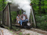 Frank crossing Big Bend Bridge blowing the whistle for the camera man as the exhaust barks as East Wind is enveloped in steam. Dick adding coal to the firebox as the passengers ready themselves for the next run. |