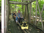 Skip blowing the whistle for the grade crossing as Lynn starts into the grade at Mackey's Run. Dick with his engine spewing the steam from it's stack as it crosses the Trestle Bridge. |