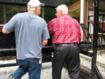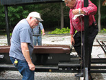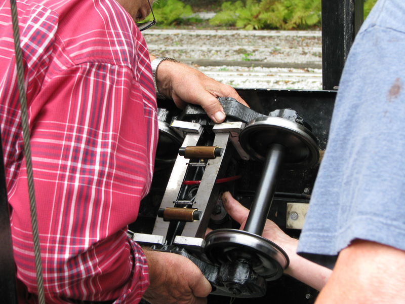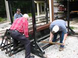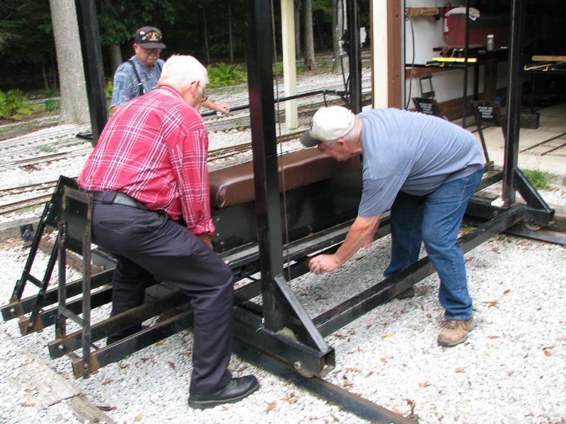 Paul was lifting the end of the car as Ken put 2 X 2's 3 feet long underneath the car and Wayne steadied the lift from rolling. Ken and Paul discussed the weight of the car as we have bricks in the opposite end of the riding car from the control point end to offset when only one person is riding. |