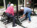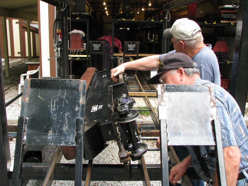 We had a smaller turnout as some of the guys went on a ramble so we are checking out the trucks on our 8' long rider cars that the wheel flanges seem to be rubbing on the underside of the footplate. Wayne Boron, Paul Emch and Ken Brooks work to support the car to lay it over. |