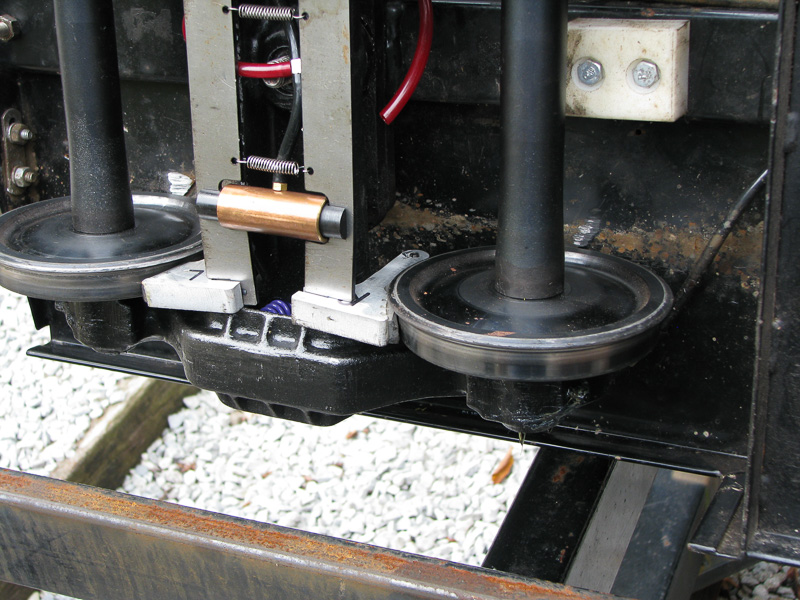 This shows how we lay the car over supported on those wood supports that Ken slipped underneath the car when we check the trucks. A close-up of the underside of the footboard shows the shiny spot where the wheel flange has been rubbing. |