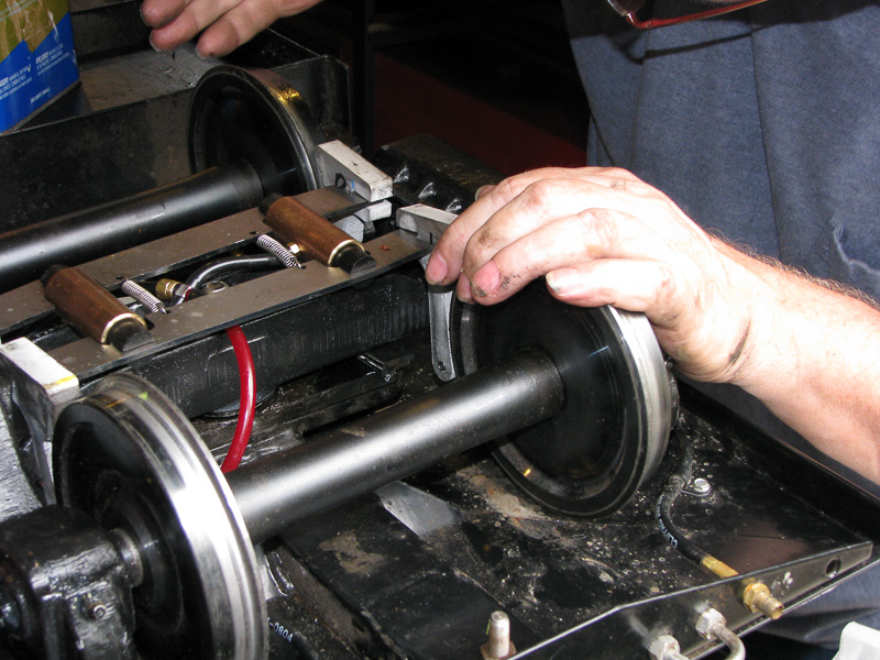 As Paul holds the truck, Ken removes the airline for the brakes so the truck can be pulled free of the bolster pin. Looking at the truck at the opposite end of the car you can see above the wheels the shiny spots were it's rubbing underneath the floorplate also. |