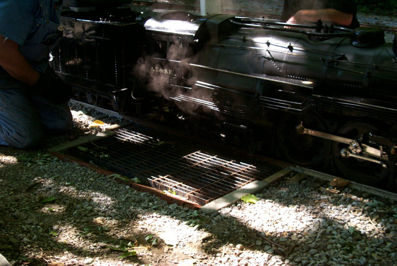 George Davidson with his electric powered cab. Some of the battery powered units started to run short on power after yesterdays all day run. The Hudson over the ash pit. |