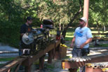 Jon Jaros watching over the Hudson as the steam pressure builds. Roy Harris just finished loading Matt Philpotts electric powered cab engine train. |
