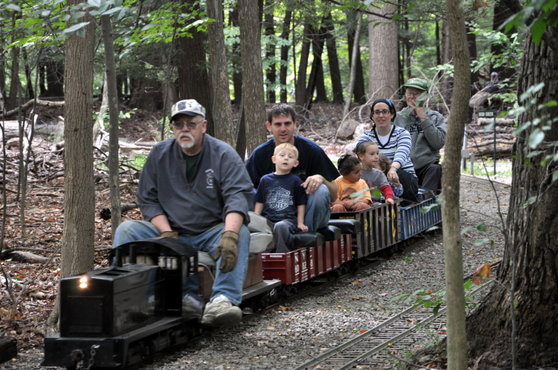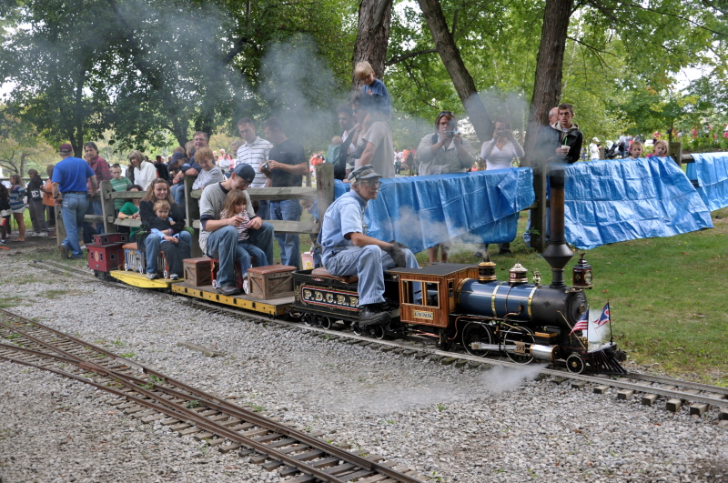 Robbi Haines and Bill Deptowicz coming into the station with the 4 year old engineer Ethan at the controls before the public run. Rick Nagy departing the station will a full load of passengers and Bill Besselman is his conductor. |