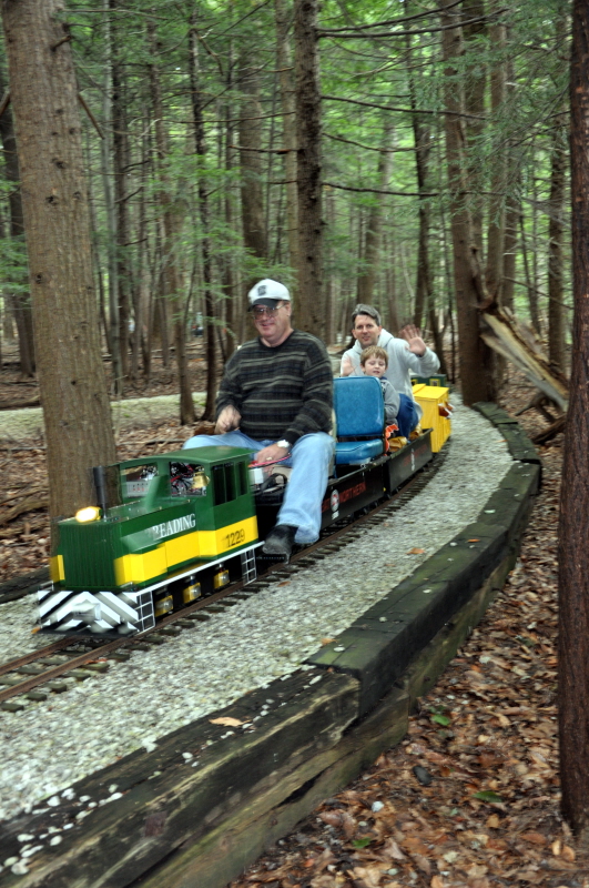 A smiling Ethan Deptowicz coming out of the covered bridge running the Thomas engine for the photo run by. Kitty Shriver coming down the grade from Hilton with guests on her train as she passes the photographer at Gulch. |