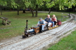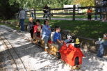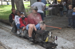 Karl Losely waits for Robbi to finish the riding instructions to his passengers before he departs. Rick starts moving his trainload of passengers and his conductor for this run is Lew Fowler. |