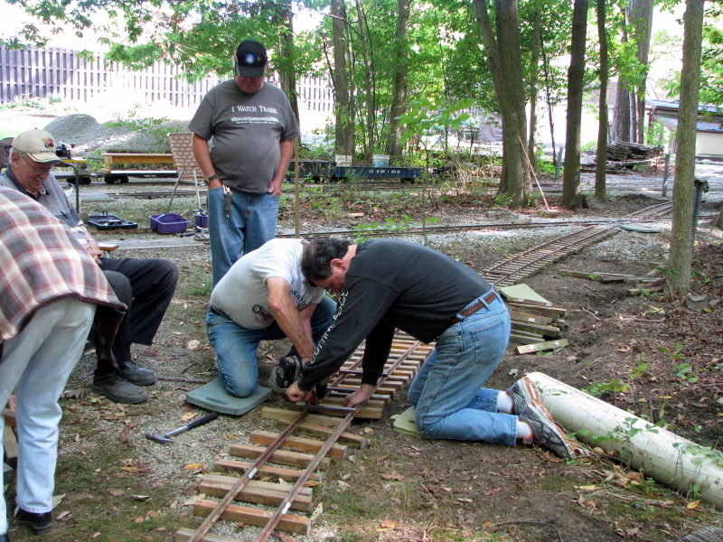 Edith Hacker, Jerry Bell and Lois Smoley, sitting in a chair, watch the progress of the tie laying as they are close to connecting up the rail on the far side of the access road. A closer view of the work area and it looks like the guys have at least one more panel to make up in which we will have to cut the rails to length and that's it for today. |