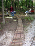 Break time! You can see the progress we have made up to this point at the ditch which will have to be dugout a little deeper to allow clearance over top of the PVC culvert pipe for the ties. After the break Frank Foti was assisting Frank Smoley with the fastening down of the ties as they made progress across the road under Dick Clark and Rick Nagy's watchful eyes. |