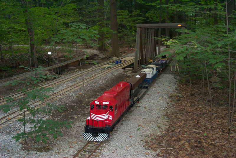 Here's a sight you don't see. The clubs GP38 hauling the work train. Hopefully Mark won't have too much trouble getting parts for the work engine. |