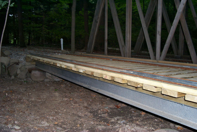 The guard rail has been fastened down on the crossover rail from Branch Line. Both guard rails are finished and the wooden curb along the bridge decking ends has been fastened down. |