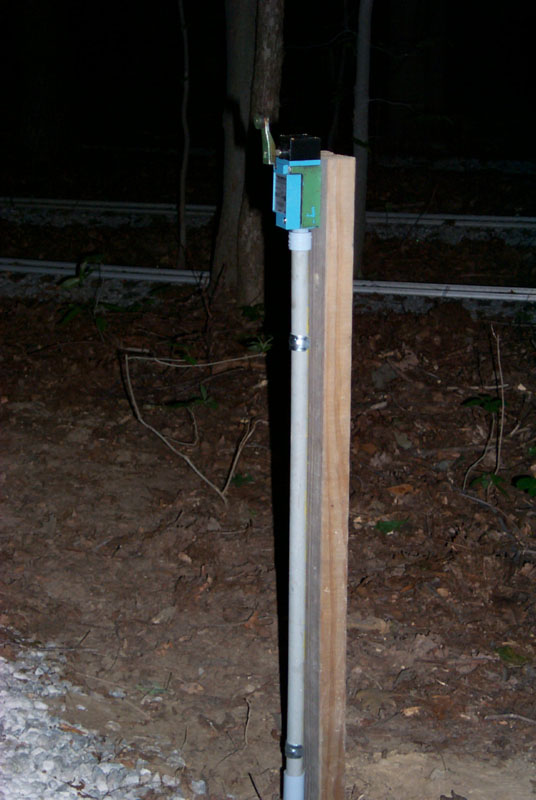 As darkness settles in I checked out how George and Dave made out with the signal wire project on the Branch Line. These two pics show the switch stand and the signal post with conduit attached. |