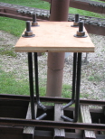 Wally Pausch is helping along with Lew Fowler as we check the depth of the hole to decide if we need to dig a little deeper. Bill made a wood template to hold the four 3/4 inch diameter anchor bolts in proper position in the concrete. |