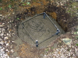 Wally mixing up a batch of concrete in a wheelbarrow which will be often repeated as bag after bag was mixed and placed in the hole. A view of the hole with the reinforcing cage in place. |