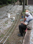 While we were working on the foundation, Rick Nagy and Dick Clark were fastening the rails down to the ties to complete the closure of the siding rail to the switch. As soon as the photographer got there the guys had to take a break and admire their handiwork. |