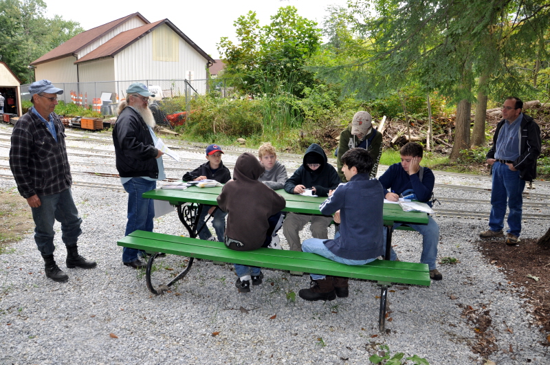 The partially stripped of forms foundation for the railroad signal in front of the steaming bays that Bill Deptowicz has been working to install. In conjunction with our club run, the Boy Scouts were at the track learning about various aspects of real train operation working towards their railroad merit badge and Dick Clark is reviewing railroad signals with them. |