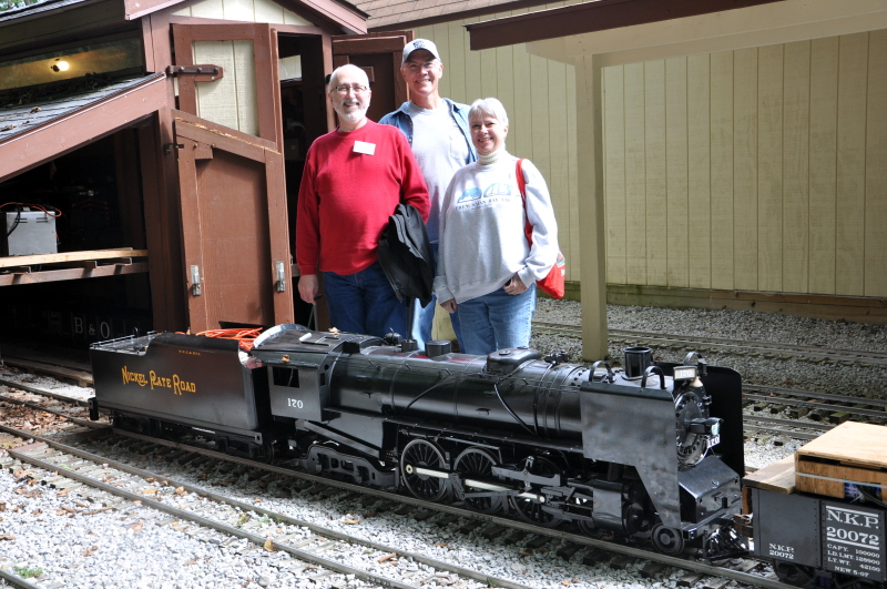 After George Metts worked on the speed controller, Dave moved the engine and its rider car out on the steaming bay turntable to test the unit out on the track with Wayne Boron lookng on. Judy Oscker with her brother Tom Harwedel from Texas and her cousin, Gary Deimling posing behind Paul Emch's NKP Railroad Hudson, which Gary particularly admired. |
