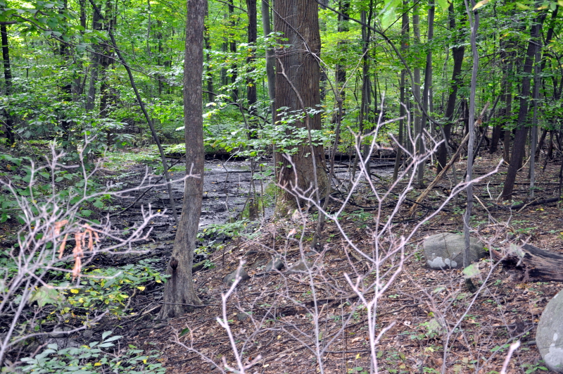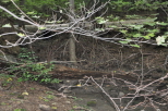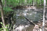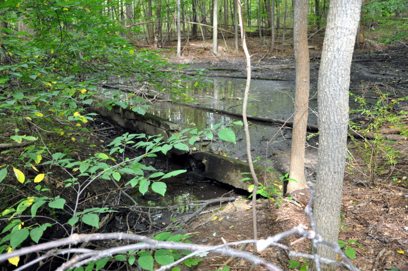 A view looking northwest showing where the dam has failed thus letting the pond drain down. This is a view looking west across the dam at what water is still in retention -- no lily pads to be seen. |