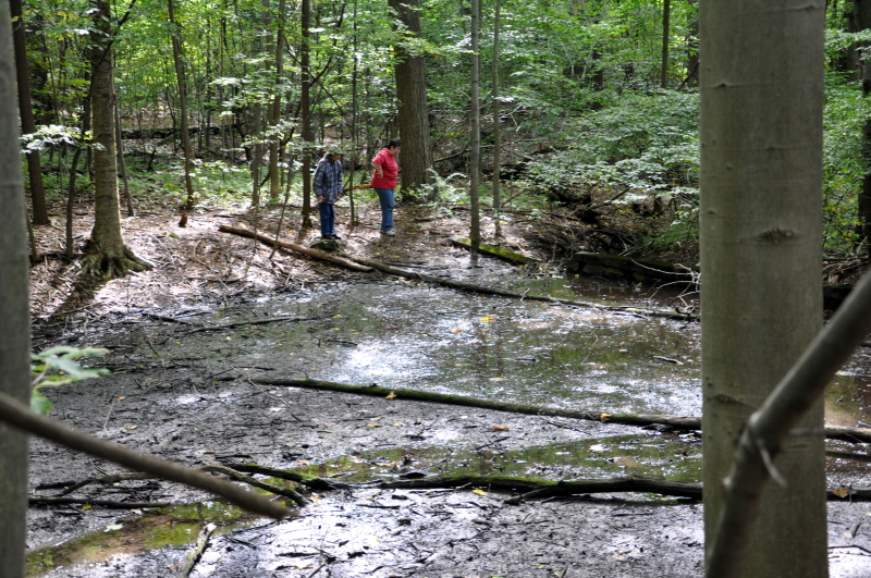 A view of the pond is just a trickle as we look southeast. A view looking across the pond at Edith Hacker and Robbi Haines standing at the edge where the dam has been compromised. |