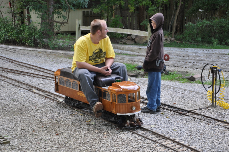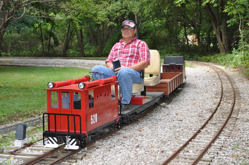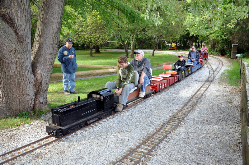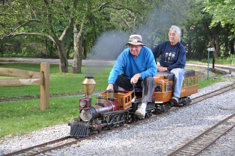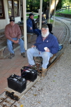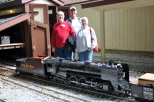 A closeup of the Deptowicz's and the Snoopy train with Ethan giving the photographer his best enthusiastic smile. Judson Elliott in front of the station with the electric engine he is scratch building using drive units from Plum Cove with Steve, George and Dick looking on. |
