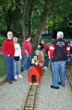 Ted and Marie coming into the station with a tender behind. Tom, Judy, and Robbi look on as the Deptowicz family (Ethan, Amy and John) on the Snoopy train arrive at the station to meet Bill Besselman. |