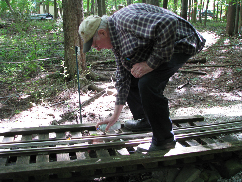 The ties adjacent to the mile markers were painted red but they were quite faded out so today Dick Clark was going around repainting the tie that indicated the mile marker point. Here's Dick repainting the tie at mile marker No.3 just out of Horrendous. |